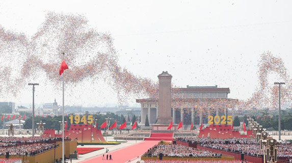 চীনা জনগণের জাপানি আগ্রাসনবিরোধী যুদ্ধ ও বিশ্বের ফ্যাসিবাদ-বিরোধী যুদ্ধে বিজয়ের ৮০তম বার্ষিকী স্মরণে বুধবার বিজয় দিবসের সমাপ্তিতে রাজধানী বেইজিংয়ের থিয়ানআনমেন স্কোয়ারের আকাশে ছেড়ে দেওয়া হয় ৮০ হাজার ঘুঘু। ৮০ হাজার বেলুনও উড়েছে সেইসঙ্গে।