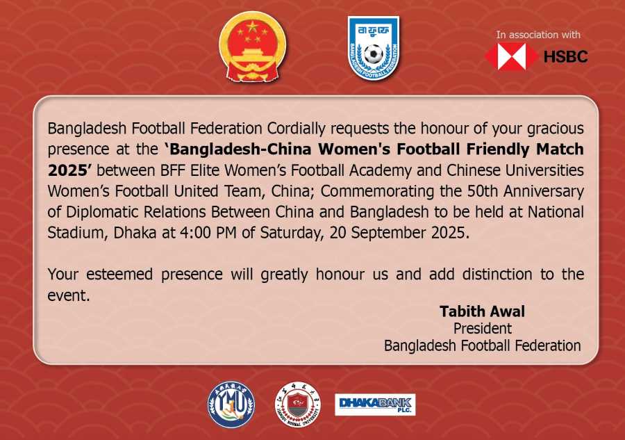 বাংলাদেশ ও চীনের কূটনৈতিক সম্পর্কের ৫০ বছর পূর্তি উদযাপন উপলক্ষে বাংলাদেশ ফুটবল ফেডারেশনের আয়োজনে আগামী শনিবার (২০ সেপ্টেম্বর) ঢাকার জাতীয় স্টেডিয়ামে অনুষ্ঠিত হতে যাচ্ছে ‘বাংলাদেশ-চীন নারী ফুটবল প্রীতি ম্যাচ ২০২৫’। বিকেল ৪টায় শুরু হওয়া এই ম্যাচে মুখোমুখি হবে বিএফএফ এলিট উইমেনস ফুটবল একাডেমি ও চীনের বিশ্ববিদ্যালয় নারী ফুটবল ইউনাইটেড টিম।