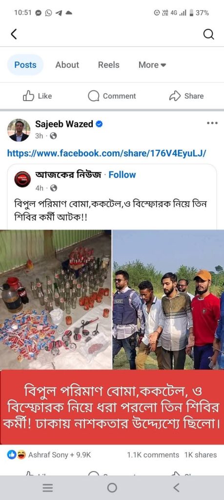 জনাব জয় ‘আজকের নিউজ’ নামের একটি ফেসবুক পেইজের ফটোকার্ড শেয়ার করেছেন। যাতে বলা হয়েছে, “বিপুল পরিমাণ বোমা,ককটেল,ও বিস্ফোরক নিয়ে ধরা পড়ল তিন শিবির কর্মী! ঢাকায় নাশকতার উদ্দেশ্য ছিল।”